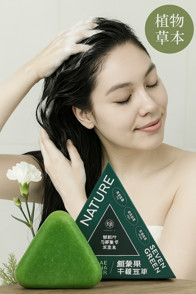هذا المنتج هو قالب صابون شامبو "Nature Triangle" من "Seven Green"، مصمم خصيصًا للعناية بالشعر.